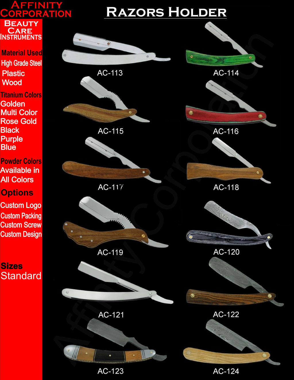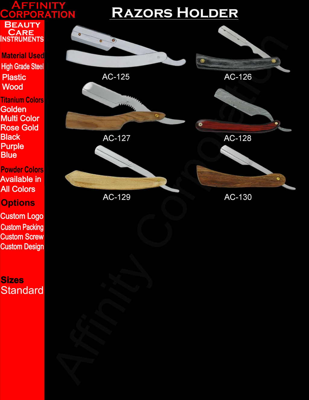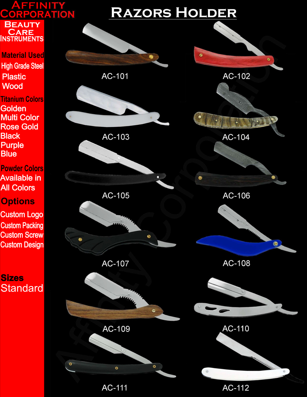 Affinity Corporation was founded in 1990 as the manufacturers in Manicure & Pedicure Implements. The Company has had many successes since its establishment and achieved the landmark of quality standard of ISO 9002 & BSCI.